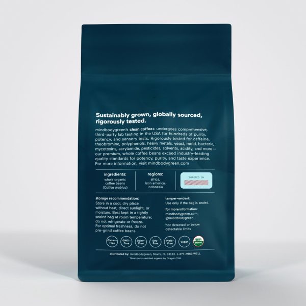 †not detected or below detectable limits. mindbodygreen's clean coffee+ undergoes comprehensive, third-party lab testing in the USA for hundreds of purity, potency, and sensory tests. Rigorously tested for caffeine, theobromine, polyphenols, heavy metals, yeast, mold, bacteria, mycotoxins, acrylamide, pesticides, solvents, acidity, and more—our premium, whole coffee beans exceed industry-leading quality standards for potency, purity, and taste experience.